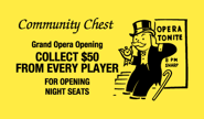 - Grand Opera Night {Opening in previous US editions, not in the deck in UK editions}. Collect $50 from every player for opening night seats. <A wall sign near a flight of stairs reads "Opera Tonite - 8 PM Sharp"; Mr. Monopoly leans against it checking his pocket watch in annoyance>