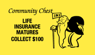 Msign.} - Life insurance matures – Collect $100 <Below an I N S sign stands a bent Mr. Monopoly, his long beard brushing on the floor>