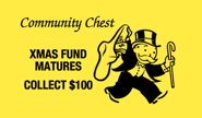 - Holiday {Xmas} Fund matures. Receive {Collect} $100. <Mr. Monopoly carries along a giant Xmas sock containing a sheaf of cash>