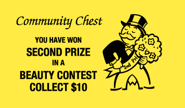 - You have won second prize in a beauty contest. Collect $10. <Mr. Monopoly preens with a sash and a large bouquet>