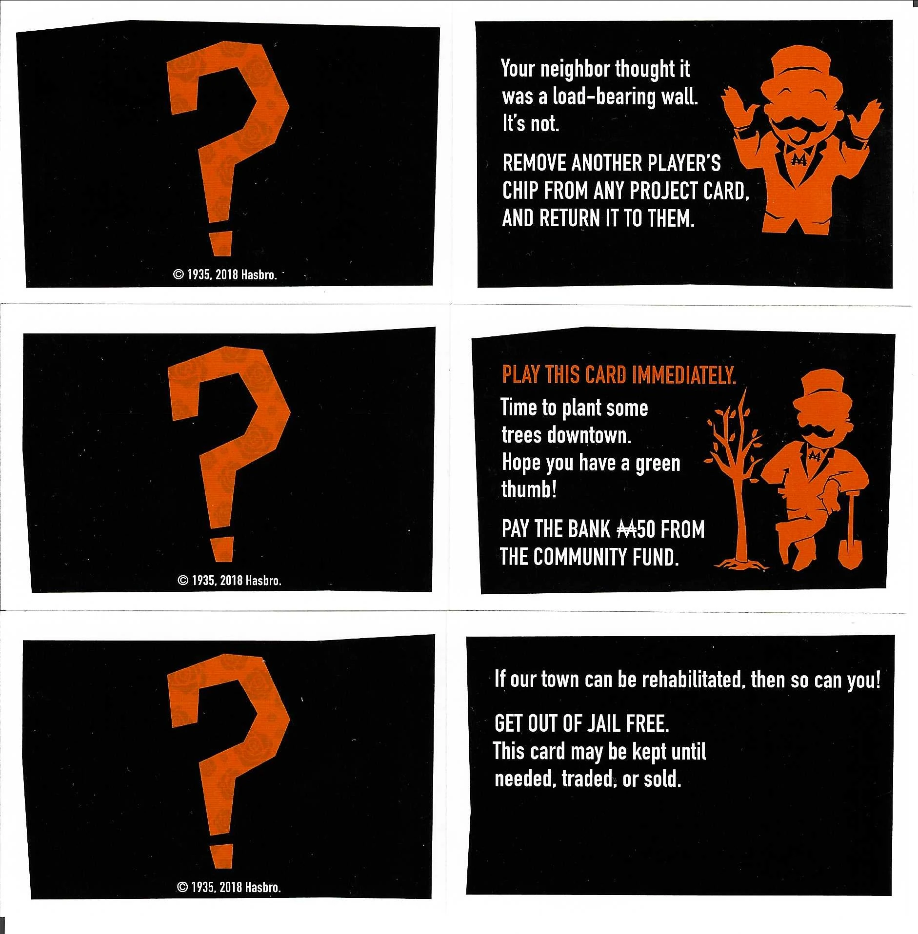 The Project cards can be placed near their corresponding spaces around the board, or they are held by the Bank. Place all the Chance cards facedown on the draw pile. Put $1848 on the Community Fund at the opposite corner from the Chance card draw pile.