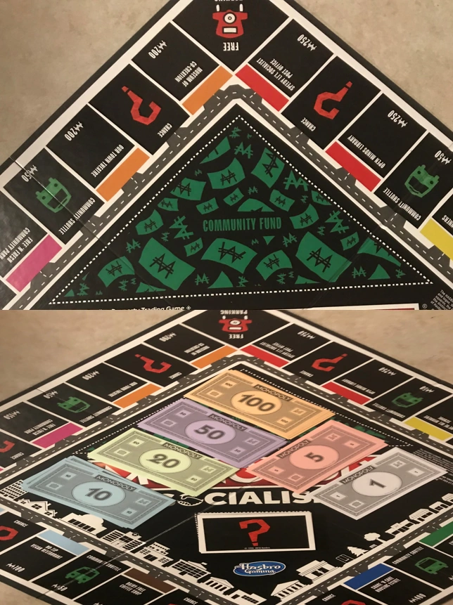 The Community Fund is in the middle of the gameboard. It should be filled with money (bottom picture) to keep the game going. When it empties out (top picture), it's GAME OVER.
